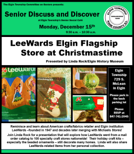 Join us at the next Elgin Township Senior Discuss and Discover on Monday, December 15th, at 9:30 a.m. as the Elgin History Museum’s own speaker Linda Rock presents on LeeWards – an American crafts and fabrics retailer that was an Elgin institution for many years. It was founded in Elgin in 1947, and their holiday craft kits (especially the beaded ornaments) still decorate many homes. In fact, neighboring communities would bring busloads for shopping trips at the LeeWards flagship store in Elgin on Route 31.