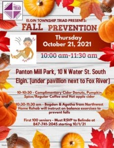 Elgin Township TRIAD invites our seniors to a “Fall Prevention” presentation on Thursday, October 21st, at 10 am at Panton Mill Park, 10 N Water, South Elgin under the pavilion. We will be outside and hoping for a nice Fall morning.